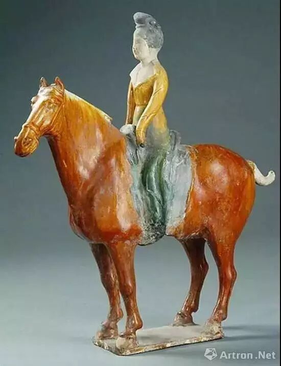 唐代的三彩器,有很多骑马的贵族女俑的形象。这一时期,她们已不再是羞羞答答的大家闺秀,而是充分展现出了唐代女性的曼妙、活泼、自由、奔放、勇健的飒爽英姿。