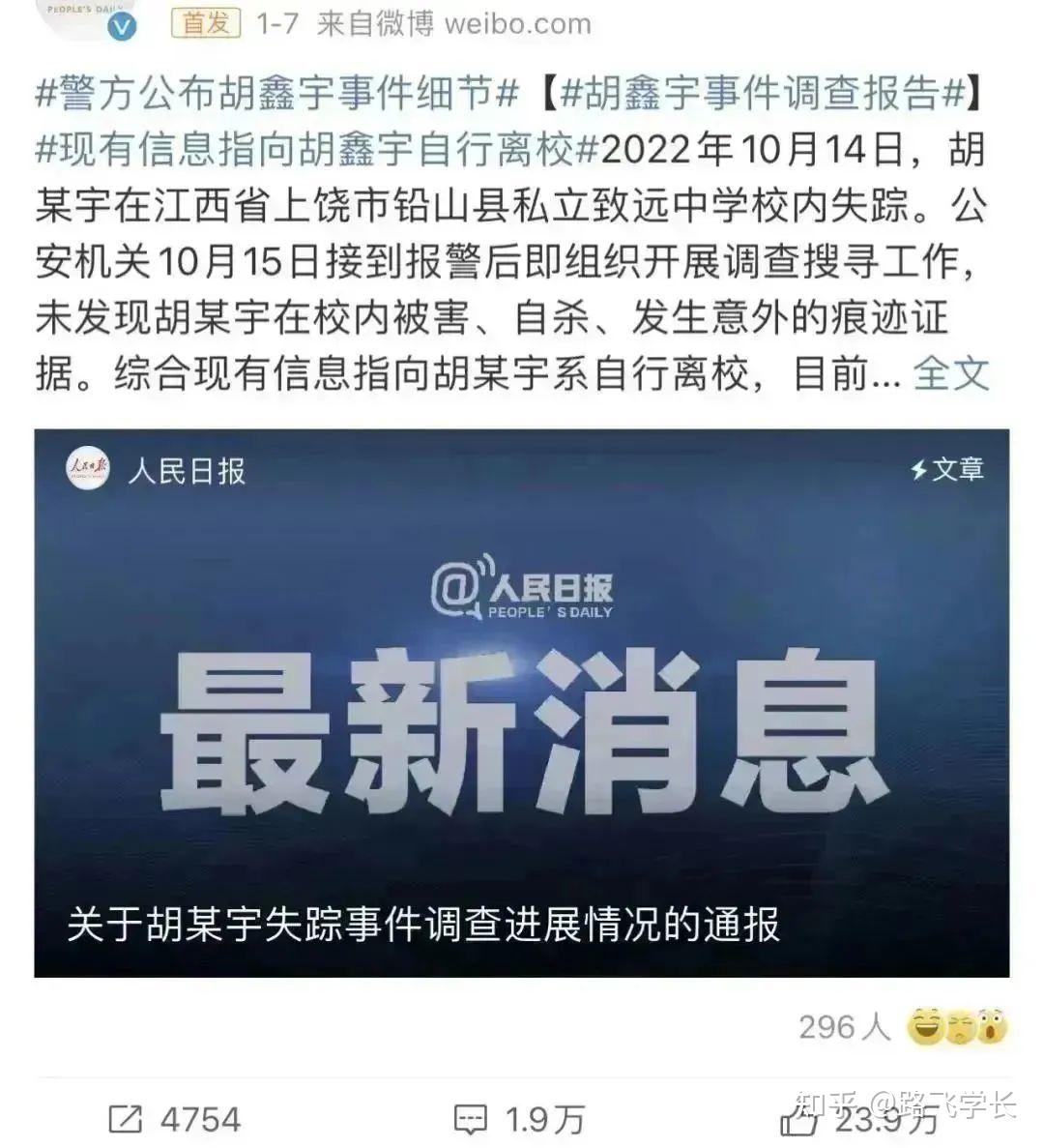 2022年10月14日,江西省上饶市铅山县致远中学高一学生胡鑫宇失踪,2023年1月 28日,胡鑫宇尸体被发现。在国内刑事专家现场指导下,公安机关通过开展调查访问、现场勘查、尸体检验、物证检验鉴定等工作,认定胡鑫宇系自缢死亡。2023 年 2 月 2 日,江西省、市、县联合工作专班在上饶市铅山县召开新闻发布会,通报胡鑫宇事件调查情况。