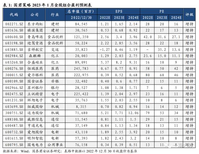 国君策略2023年1月金股组合