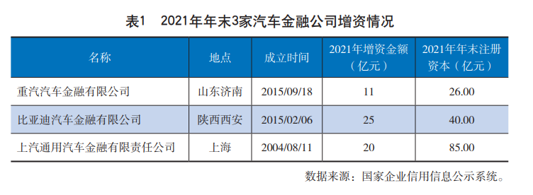 截至2021年年末,3家汽车金融公司注册资本明细如表1所示。