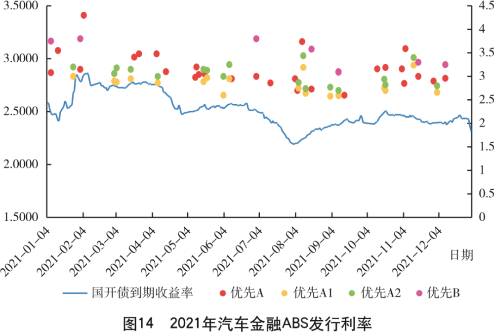 图14展示了2021年汽车金融ABS发行利率与一年期国开债利率的比较。2021年全年车贷ABS发行利率窄幅震荡,整体维持在低位。