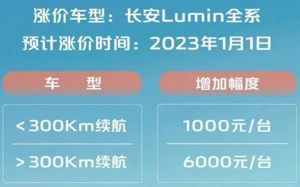 据长安新能源官网显示,其旗下微型电动车——长安Lumin在1月1日完成价格调整,最高涨幅6000元。