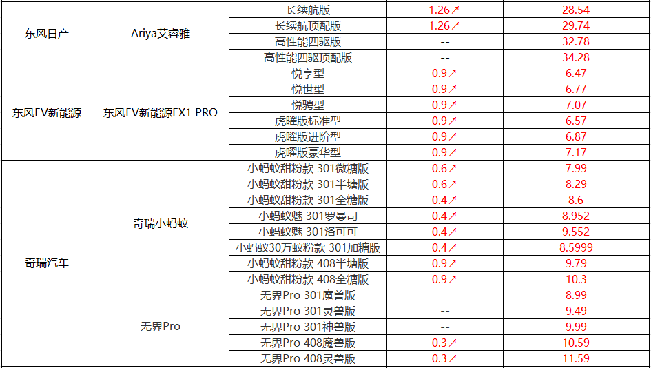 2023年1月1日,奇瑞新能源官方发布调价消息,小蚂蚁和无界Pro两款车型将调整售价,其中小蚂蚁车型原售价7.39-9.4万元,调价后售价7.99-10.3万元。无界Pro车型原售价8.99-11.29万元,调价后售价8.99-11.59万元。