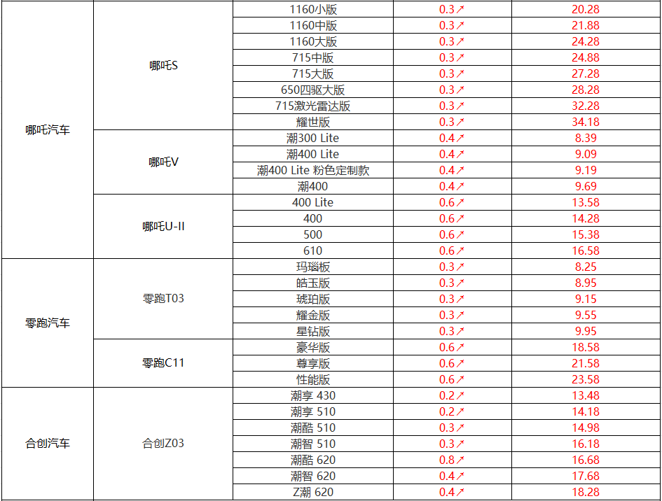 据哪吒汽车官方消息,其旗下哪吒S、哪吒V和哪吒U-II售价已于近日进行调整,其中,哪吒S售价上调3000元,并针对部分配置进行了小幅调整,调整后售价区间为20.28-34.18万元;哪吒V售价上调4000元,同时车型配置进行了微调,调整后售价区间为8.39-9.69万元;哪吒U-II售价上调6000元,配置不变,调整后售价区间为13.58-16.58万元。