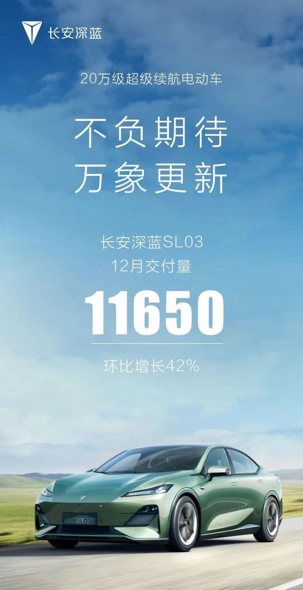 1月2日,长安深蓝公布了深蓝SL03去年12月份的销量达11650辆,环比增长42%。据悉,该车于去年7月底上市,定位为中型轿车。新车基于长安EPA1纯电平台打造,拥有增程版、纯电版和氢能版三种动力选择。纯电版车型搭载160kW和190kW的电机,峰值扭矩均为320N·m。电池容量分为58.1度和79.97度两种(均为三元锂电池),综合续航里程为515km和705km。其中515km续航+190kW版本5.9秒可以“破百”。增程版采用1.5L阿特金森循环发动机,发动机最大功率95马力,电机最大功率160kW,电机最大扭矩320N·m。