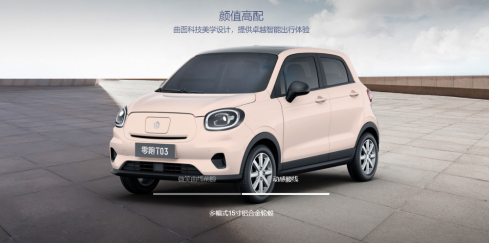 零跑T03定位5门4座微型纯电动车,动力方面分别搭载最大功率为75马力(55kW)和109马力(80kW)的两款电动机,提供31.9kWh和41kWh的磷酸铁锂电池选择,NEDC续航里程分别为301km和403km,并且支持快充功能。