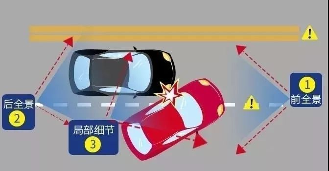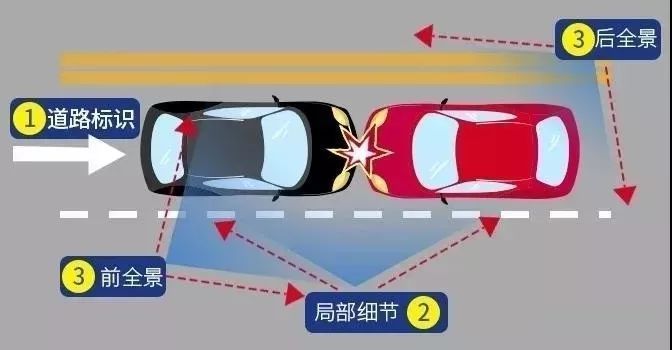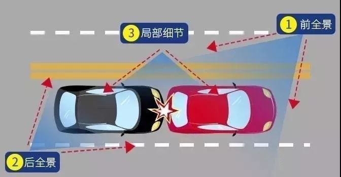 车头车尾的照片需要把两车全貌、车辆牌照之类的拍好,地上的交通线都拍出来(用以界定责任)。