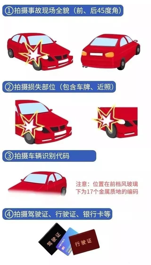 拍摄一张驾驶人站在车辆旁边的照片及对方驾驶证、行驶证。拍照时注意人员不能遮挡车辆号牌和受损部位,否则将影响取证。