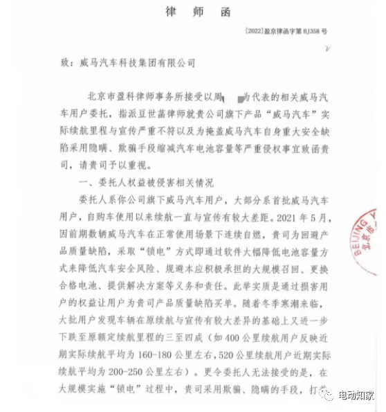 与此同时,威马汽车还被爆出主动“阉割”续航,车主联名起诉!威马厂家借检查车辆,赠送200元京东卡的“名义”,偷偷对车主的车辆“锁电”,使得车主的车辆续航大大缩减,影响使用体验。此事被媒体曝光之后,威马汽车不主动进行回应,并且持续逃避,态度高傲蛮横,引起车主众怒,173名车主已联名向威马汽车厂家发送律师函维权。要求威马公司7日内立刻停止虚假宣传,终止侵害用户权益,主动负起安全责任,弥补重大安全缺陷,赔偿用户损失,公开诚恳道歉,积极回应用户合法诉求。