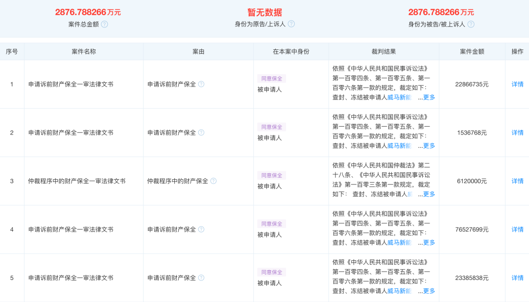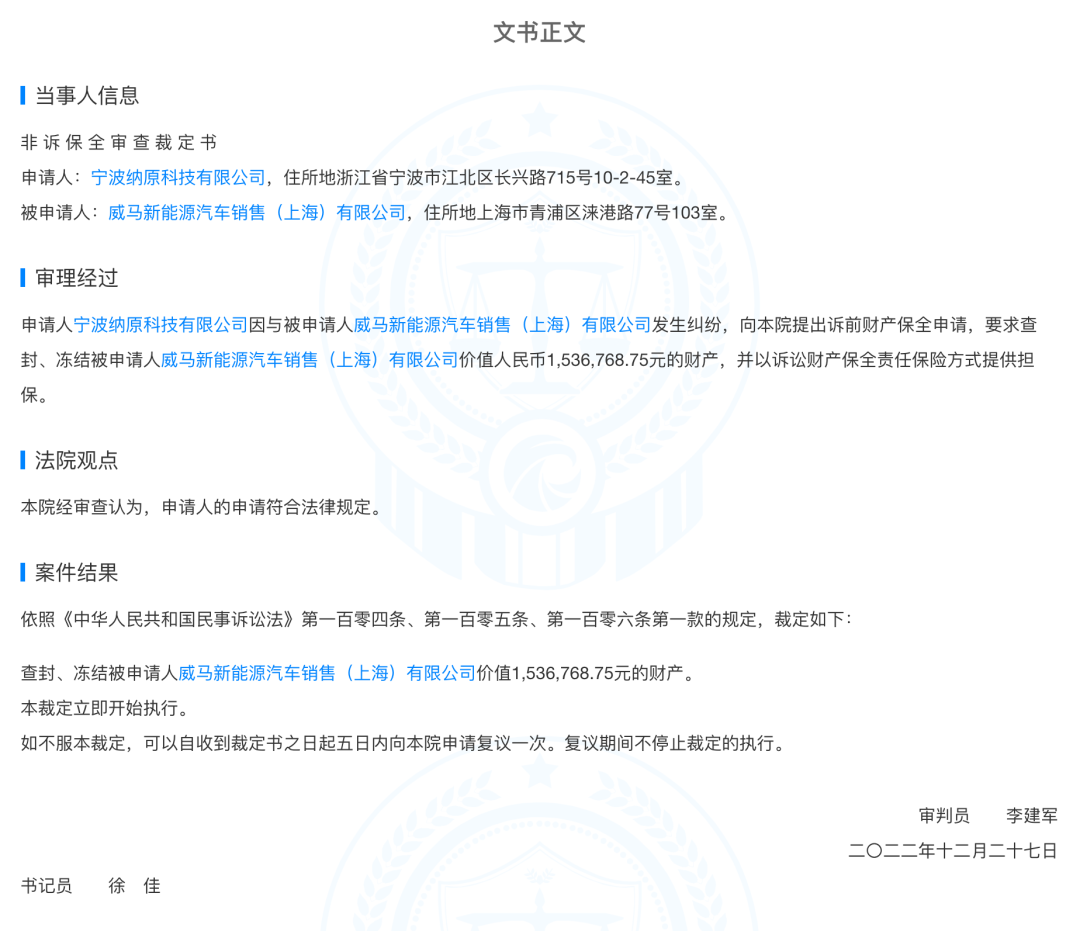 1月3日,通过天眼查获悉,威马新能源汽车销售(上海)有限公司新增多个财产保全裁定书。文书显示,上海形家广告设计有限公司、昆山建邦汽车销售服务有限公司、安吉智行物流有限公司、重庆长安民生物流股份有限公司、宁波纳原科技有限公司请求法院查封冻结威马公司共计约价值1.3亿元财产。法院认为,上述公司申请符合法律规定,裁定执行。