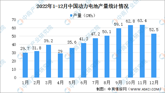 2022年12月,我国动力电池产量共计52.5GWh,同比增长65.9%,环比下降15.8%。1-12月,我国动力电池累计产量545.9GWh,累计同比增长148.5%。