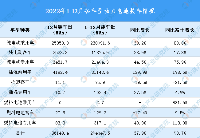 1-12月纯电动乘用车的动力电池装车量为230091.6MWh,同比增长89.0%;插混乘用车的动力电池装车量为31148.4MWh,同比增长198.5%;纯电动专用车的动力电池装车量为21404.3MWh,同比增长75.9%;纯电动客车的动力电池装车量为11375.9MWh,同比增长17.3%。四种车型的动力电池装车量占动力电池总装车量99.8%。