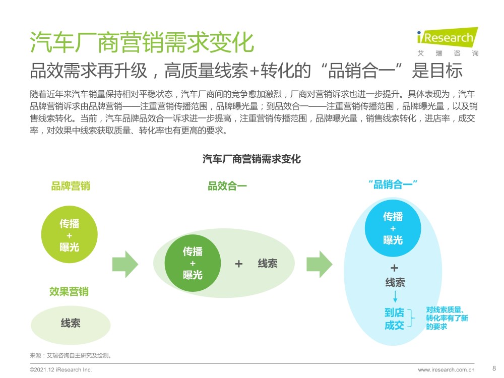汽车营销发展趋势:融合线上与线下渠道,掌握购车全链各核心节点数据,结合不同场,分析和判断用户行为与转化特征,打造更好的营销组合策略。另外,需要探索不同圈层内心需求,打造有情感、有价值的定制化内容。同时,多渠道构建品牌私域,深度运营,打造品牌特色,持续输出品牌价值和文化,提升品牌认同,开发用户终身价值。