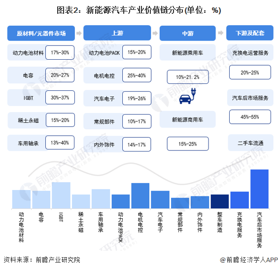 新能源汽车产业链上游包括了原材料与核心零部件,原材料例如锂、钴、镍等,核心零部件例如动力电池、车用轴承等;中游是整车制造,按用途细分为新能源乘用车和新能源商用车;下游包括新能源汽车后市场服务、电池回收等。对新能源汽车产业链各环节产品的毛利率进行统计分析得到,目前,IGBT(绝缘栅双极型晶体管)及汽车后市场服务的毛利率较高,中游的整车制造环节毛利率较低,产品的附加值较低。