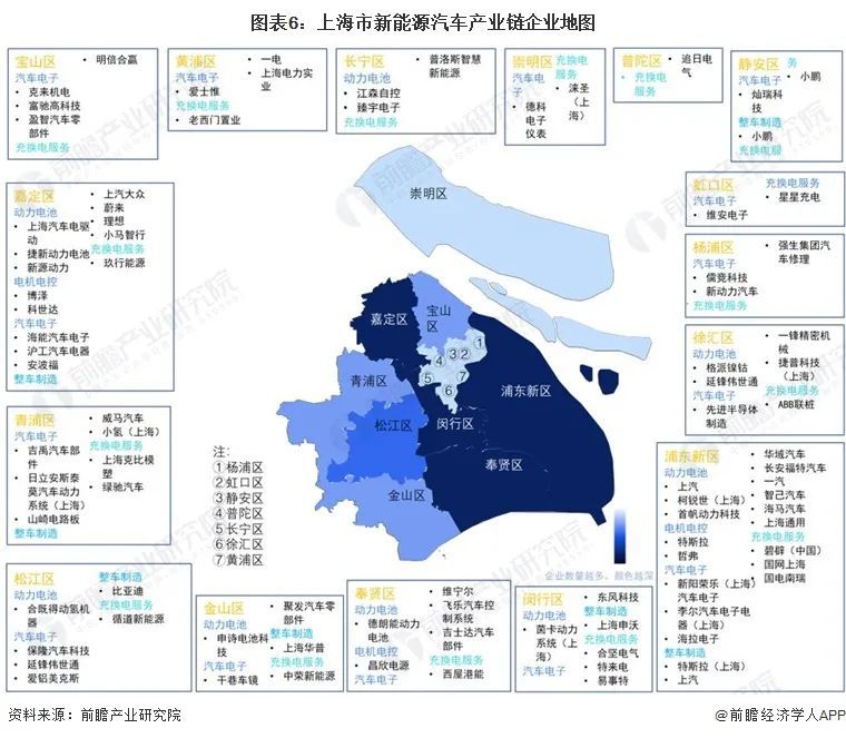 从产业链各环节的代表性企业分布地图来看,目前上海市各辖区均有汽车电子、充换电环节的企业分布,而新能源整车制造代表企业主要分布在嘉定区、奉贤区和浦东新区。相对而言,嘉定区、浦东新区、奉贤区和松江区的产业链布局更完善。