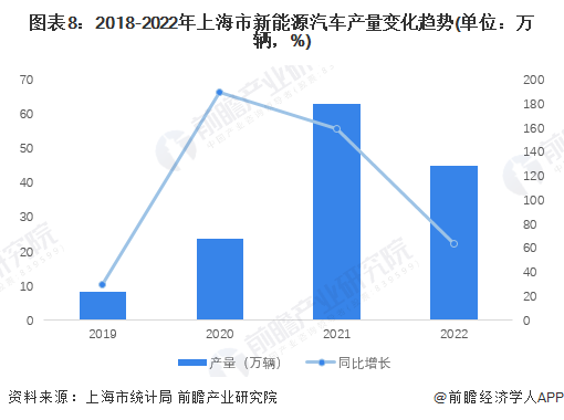 2018年以来,上海市新能源汽车产量保持稳步增长的趋势。2020年新能源汽车产量同比增长190%,突破20万辆;2021年产量继续保持快速增长,同比增长160%。根据上海市统计局发布的数据,2021年新能源汽车产业产值为1772.56亿元,同比增长1.9倍。统计至2022年7月,2022年上海市已累计生产45.08万辆新能源汽车,同比增长64.3%。