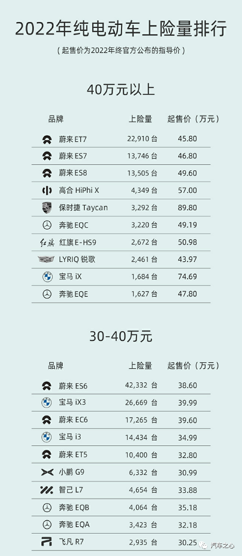 透过细分市场榜单,蔚来可以说是霸占 30-40 万元以上的高端纯电市场。