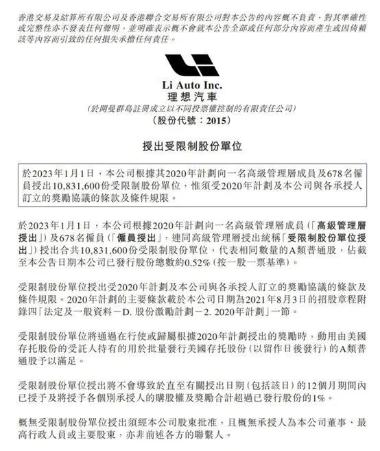 1月3日,理想汽车在港交所发布公告,宣布公司于1月1日,根据2020年计划向一名高级管理层成员及678名雇员授出1083.16万份受限制股份(代表相同数量的A类普通股),占公司已发行股份总数约0.52%。