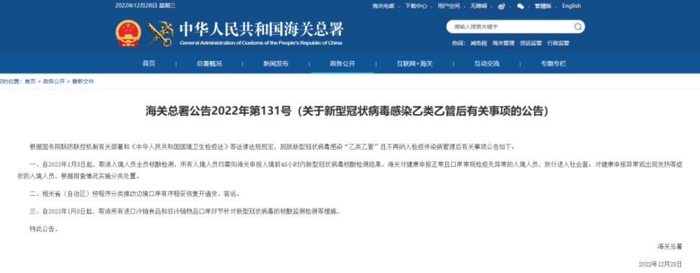 12月28日,海关总署网站发布《海关总署公告2022年第131号(关于新型冠状病毒感染乙类乙管后有关事项的公告)》。