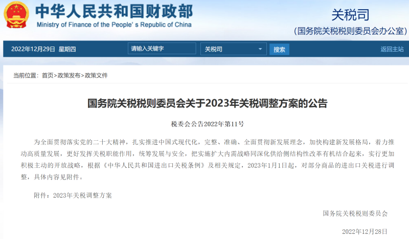 为贯彻落实党的二十大精神和党中央、国务院决策部署,充分发挥关税作为国内国际双循环联结点的作用,以高水平对外开放助力构建新发展格局、实现高质量发展,经国务院批准,国务院关税税则委员会发布公告,2023年将调整部分商品的进出口关税。