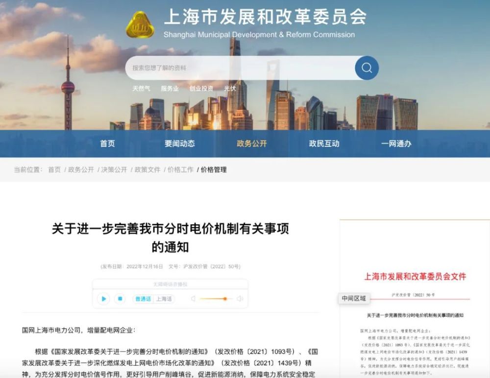 12月16日,上海市发改委发布《关于进一步完善我市分时电价机制有关事项的通知》。通知指出,一般工商业及其他两部制、大工业两部制用电夏季(7、8、9月)和冬季(1、12月)高峰时段电价在平段电价基础上上浮80%,低谷时段电价在平段电价基础上下浮60%,尖峰时段电价在高峰电价的基础上上浮25%。居民生活用电、农业生产用电分时电价政策不变,仍按原政策执行。