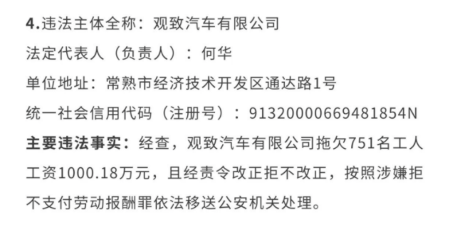 另外,2022年,7月29日,江苏常熟市人资社保局,通过官方微信公众号通报,观致汽车有限公司拖欠751名工人工资1000.18万元,且经责令改正拒不改正,按照涉嫌拒不支付劳动报酬罪依法移送公安机关处理。