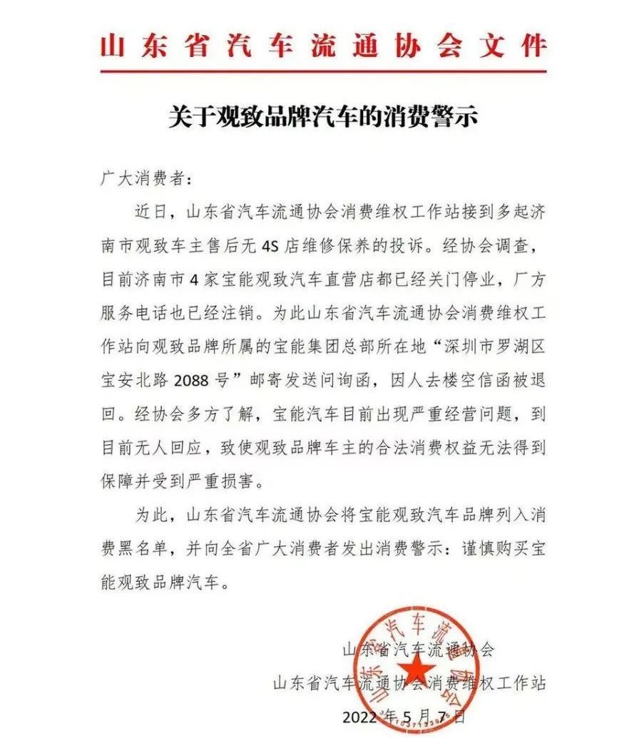 2022年5月,山东省汽车流通协会发布公告,称观致总部已经人去楼空,为了维护消费者权益,把观致汽车拉进 " 黑名单 "。文件显示,山东省汽车流通协会消费维权工作站,当时接到多起济南市观致车主售后无4S店维修保养的投诉。经过协会调查,济南市4家宝能观致汽车直营店都已经关门停业,厂方服务电话也已经注销。
