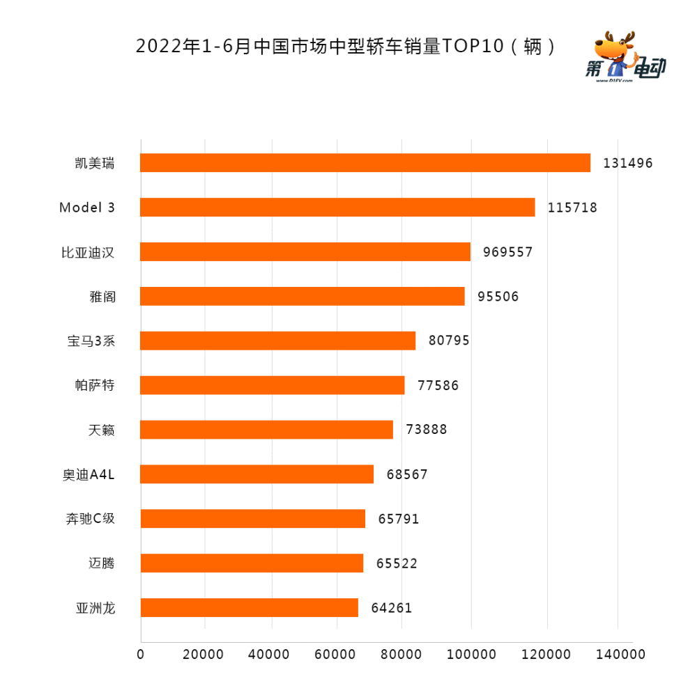 惊人的变化还在继续:2022年1-6月,比亚迪汉以96957辆的成绩进入前三名;Model 3因为4月上海疫情和5月出口欧洲而影响了国内销量,但仍以106974辆的成绩排名第二;凯美瑞以116249辆的成绩重夺半年第一。