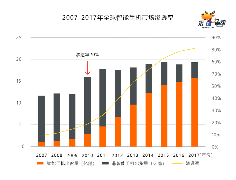 如今被广泛采纳的用以解释这一历史事件的关键原因有两个:1、2010年6月iPhone 4上市;2、免费的安卓系统在全球快速扩展。这当然是科学的说法,但忽略了一个重要的背景:2010年,全球智能手机市场渗透率达到22%,首次突破20%。渗透率之钟突破20%这个临界值,意味着指针会突然加速,新物种神话般增长的时间窗口打开了。