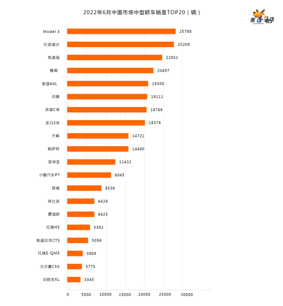 但是,凯美瑞笑不起来。在基本排除疫情影响的6月,中国中级轿车市场销量前三名依次为:Model 3 25788辆、汉25209辆、凯美瑞22651辆。也就是说,从第一台国产Model 3面市开始,仅仅过去了28个月,中国中级轿车市场的前两名,已经变成了电动车。还有一个小鹏P7,在6月第12名的位置上虎视眈眈,而红旗E-QM5则悄悄提升到第18位。