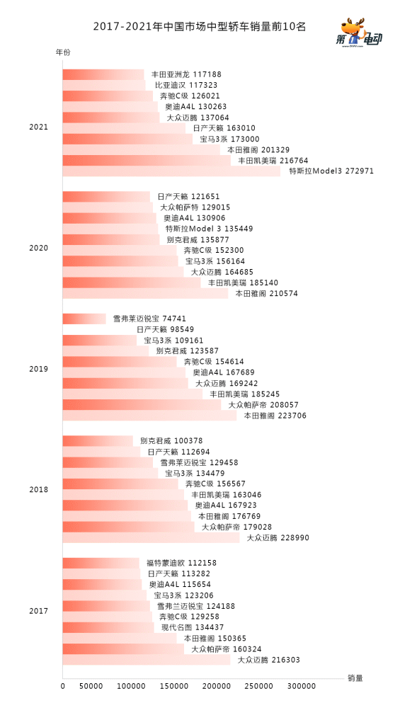 从2000年到2020年,它们享尽荣光,但2020年是转折点。如果现在回看2017-2021年中国市场中型轿车销量前10名榜单,某些潜在的重要变化,已经悄悄酝酿。