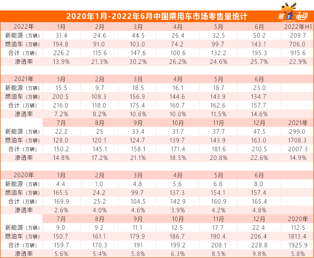 根据中汽协7月11日的预估,2022年全年中国乘用车预计总销量为2300万辆,以全年25%渗透率估算,2022年全年中国新能源乘用车预计总销量为575万辆。上半年已实现上险量为209.7万辆,下半年预计为:365万辆!即下半年月均销售量,将突破60万辆。