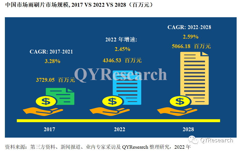 2021年中国雨刷片市场规模达到了42.42亿元,预计2028年将达到50.66亿元,年复合增长率(CAGR)为2.59%。汽车受到宏观经济环境和居民消费意愿的影响较大,2022年中国前七个月汽车产量增长0.89%,这些因素给汽车产业链的发展带来了不确定性。如果未来汽车行业出现明显下滑,会导致前装雨刷片总需求下降,与此同时加剧行业恶性竞争。