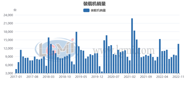 据中国工程机械工业协会统计数据显示,2022年1-11月,22家装载机制造企业共销售各类装载机114938台(详见图11),同比下降12.7%。其中,国内市场销量75732台,同比下降24.4%;出口销量39206台,同比增长24.6%。2022年1-11月共销售电动装载机1083台(其中,3吨1台,5吨1081台,6吨1台)。