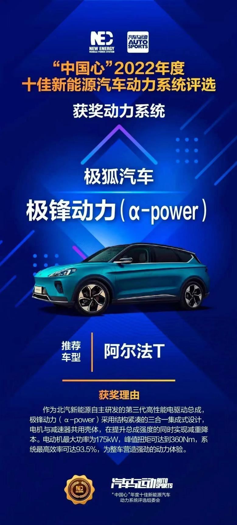 而“中国心”是国内知名度最高以及最具影响力的汽车动力系统奖项。此次获奖,不光是对极狐汽车极锋动力(α-power)的硬核实力的认可,更是北汽新能源十余年坚持自主研发结出的又一丰硕成果,再次彰显了极狐汽车的科技实力和卓越品质。