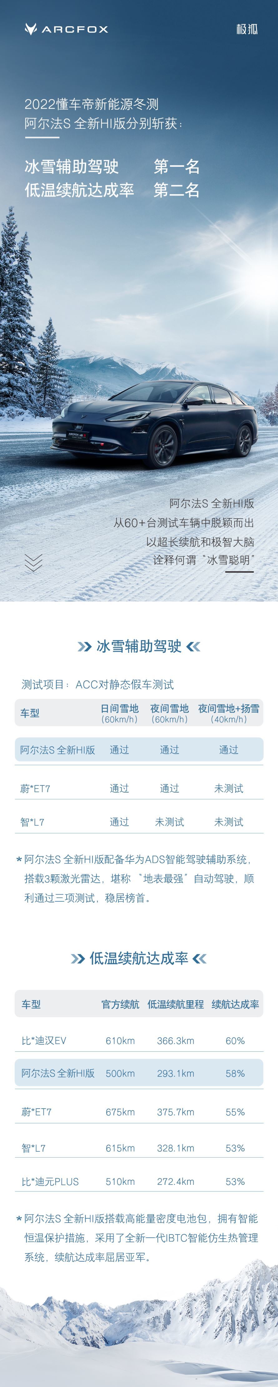 12月22日,汽车之家《超级测试-冬季实验室》也如期而至,经过多年的沉淀,其已成为业内权威评测超级王牌IP,成为引导中国汽车产业走向的重要力量。在本次冬测中,采用了常温极寒双温测试场景。其中,在北京低温环境下,极狐阿尔法S全新HI版依靠前驱异步电机和后驱同步电机的电机配置,实现了零百加速3.58s的好成绩,而在内蒙古极寒环境下,百公里制动距离仅43.6m,其动力与刹车性能在参与考核的58款热门新能源车型中处于顶尖水平,一举夺得“低温干地加速榜”及“极寒干地制动榜”双第一。