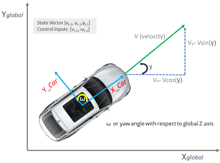 使用状态空间模型,我们可以预测汽车的下一个状态,它也被称为状态转换模型,表示汽车或机器人从当前时间步到下一时间步的运动。例如,它显示了我们汽车的当前状态是如何根据使用转向、油门和制动器对汽车[线速度V和角速度ω]的控制而变化的。转向影响ω,而油门和制动器影响线速V。从现在起,我们将把时间t时汽车的状态表示为[xt,yt,γt],控制输入表示为[vt,ωt]。现在让我们根据全局参考系推导汽车的速度分量:
