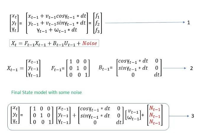 在等式2中,Xt表示时间t处的运动模型。F和B是雅可比矩阵,在我们的例子中,F是一个单位矩阵,因为汽车的移动仅基于输入控制,即线性和角速度。但是,它并不总是一个单位矩阵。想想飞机的情况,在飞机上,重力起作用,如果我们不提供控制输入,它就会坠落并坠毁。所以,在这种情况下,F不是恒等式。最后,等式3表示添加了噪声项的完整状态空间模型。