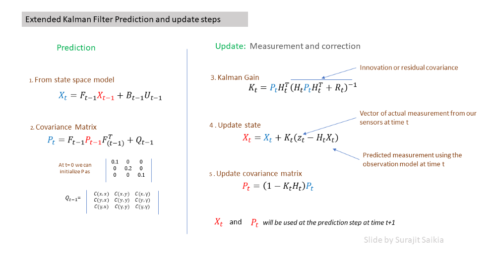 上图显示了扩展卡尔曼滤波器的预测和更新步骤。在预测步骤中,我们首先使用状态空间或运动模型来估计状态(Xt)(我们去除了噪声项,只是为了让它看起来干净)。然后,我们使用之前在时间t-1处的协方差矩阵P获得时间t处的状态协方差矩阵P。状态协方差矩阵包含状态的不确定性。然而,对于第一次迭代,我们没有协方差矩阵,所以我们初始化它,如上图所示。此外,汽车的初始状态向量和控制命令将为零。