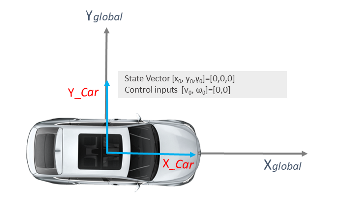 EKF的目的是使卡尔曼滤波器能够应用于机器人等非线性运动系统,EKF生成的状态估计比仅使用实际测量值更准确。在本文中,我们将简要介绍扩展卡尔曼滤波器,并了解传感器融合的工作原理。为了讨论EKF,我们将考虑一种机器人车(自驾车车辆在这种情况下)。如下图所示,我们可以在一个全局坐标系中为这辆车建模,坐标为:Xglobal、Yglobal和Zglobal(面朝上)。X_car和Y_car坐标属于以线速度(V)和角速度(ω)移动的车的坐标系。横向角(γ)测量汽车绕全局Z轴旋转的程度。