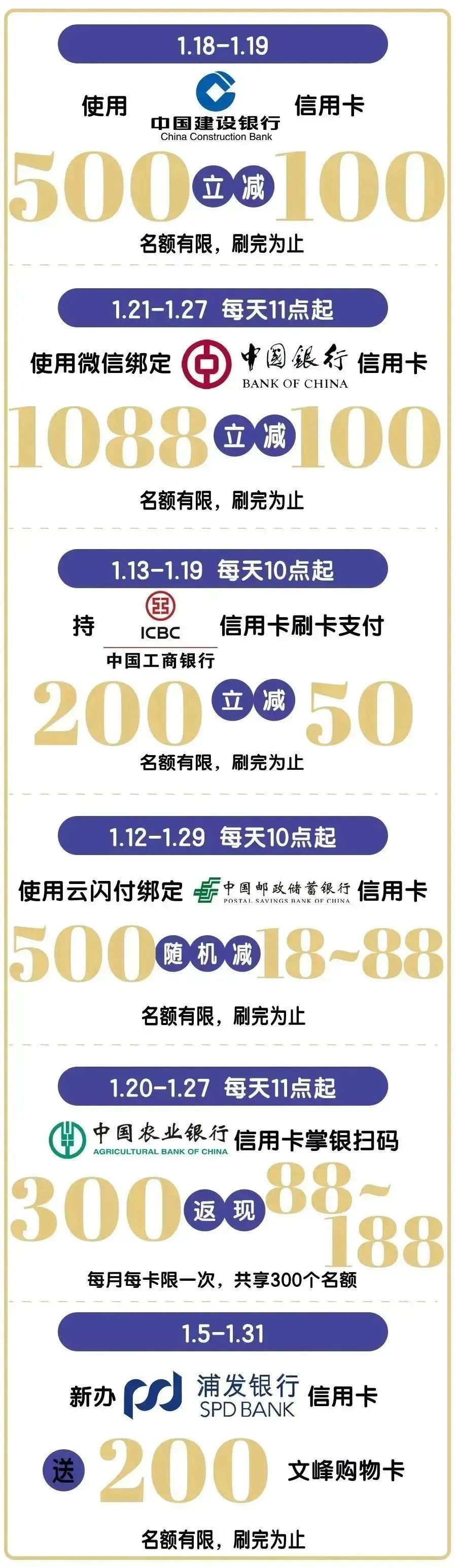 1月13日起,用户登录云闪付APP,进入首页“天天U惠”,“购券U惠”,绑定62开头银行卡支付购“2元购60元优惠券”,在文峰海门店百货类消费时使用云闪付支付可最高可享受满1000元立减60元优惠,单票限用一张,票券承兑有效期7天。券数量有限,先到先得。