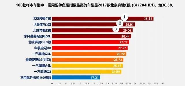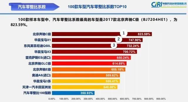 100款车型零整比系数的平均值为350.93%,奔驰C级以823.59%的成绩远超平均值和其他99位选手,意味着其零件维修价格也是最高的。