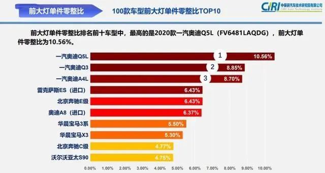 作为知名灯厂,奥迪在前大灯单件零整比前十排行中傲视群雄,国产奥迪Q5L、奥迪Q3和奥迪A4L包圆了冠、亚、季军。