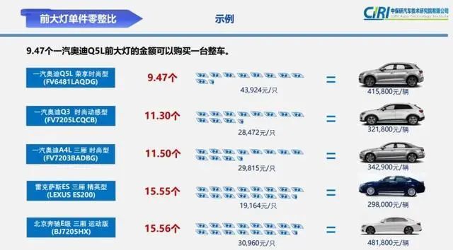 在中保研给出的数据中,有一组很有意思。9.47个奥迪Q5L前大灯的价格可以买一台整车;11.3个奥迪Q3的前大灯价格可以购买一辆整车……只能说,不愧是灯厂,到哪都发光发亮。