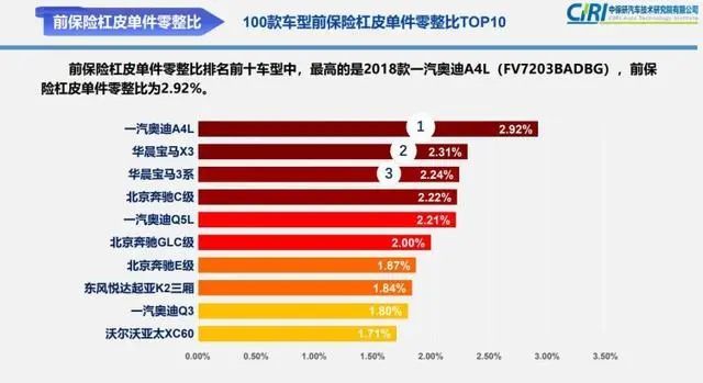 在零整比系数前十中,奔驰、宝马各占三席,除了国产宝马3系,其余车型均排在奥迪A8的前面。照这么看,奔驰宝马维修更贵,但其实奥迪也是个秀儿。