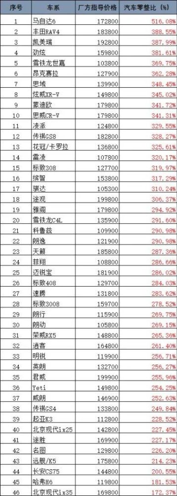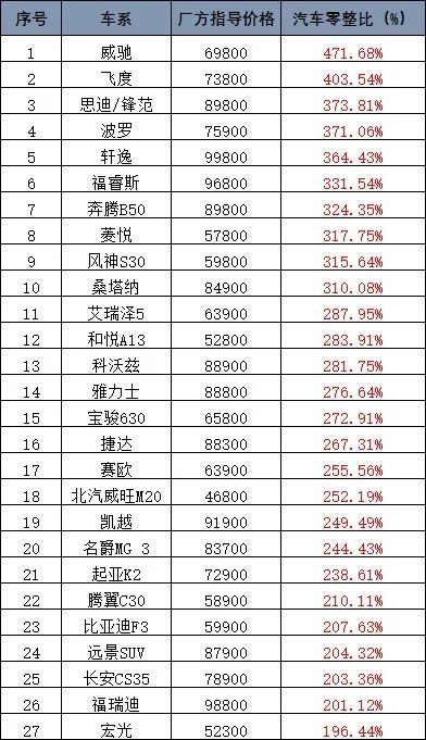 下面,我们按价格区间来看看各种常见车型的零整比排名情况。
