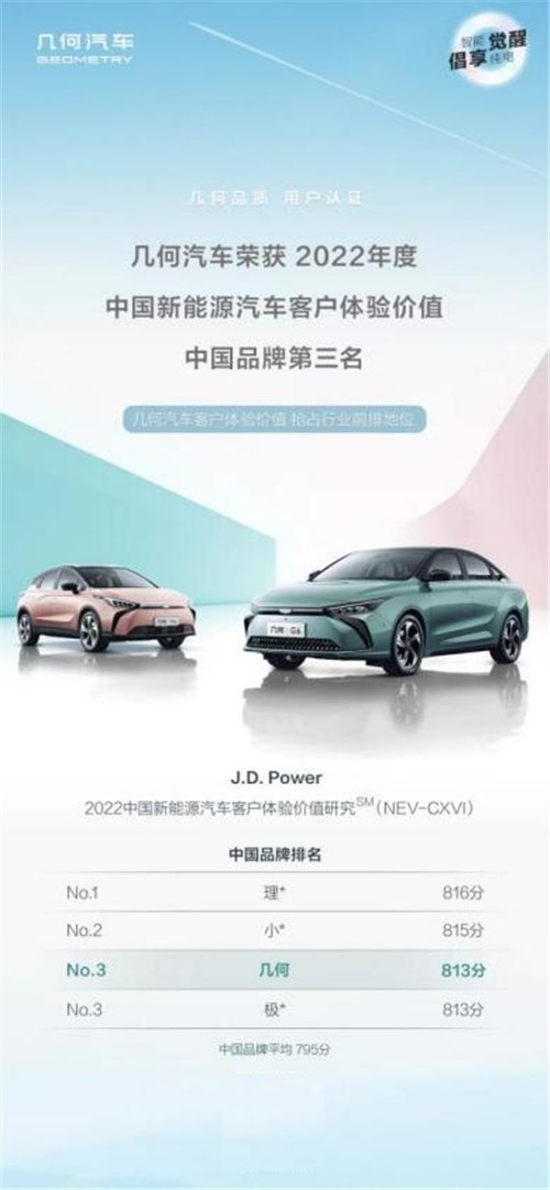 由J.D.Power发布的2022中国新能源汽车客户体验价值研究(NEV-CXVI)显示,几何汽车以813分的成绩远超中国品牌平均795的得分成为前三,在传统新能源品牌中位列第一。几何汽车能获得如此成绩,代表用户对其整车品质和品牌服务的认可和肯定,也意味着几何汽车建设的服务标准和渠道体系获得了阶段性成功。