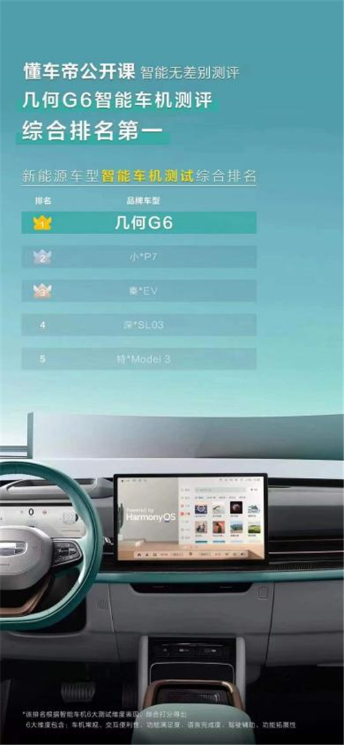 在懂车帝举办的智能无差别测评中,几何G6基于HarmonyOS开发的超电智能座舱,凭借在常规功能、交互便利性、功能满足度、语言完成度、驾驶辅助、功能拓展性六个维度的综合领先获得排名第一的成绩。