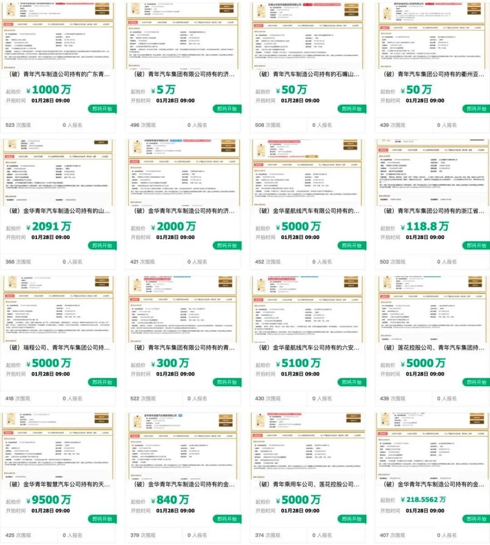 此外,将被拍卖的还有公司股权。例如莲花控股公司、青年汽车集团持有的六盘水青年曼公司100%股权,将以5000万元起拍价进行拍卖;青年莲花控股公司持有的广西弘臻青年新能源汽车公司51%股权,将以1.02亿元起拍;金华青年智慧汽车公司持有的天津青年汽车制造有限公司95%股权,将以9500万元起拍...