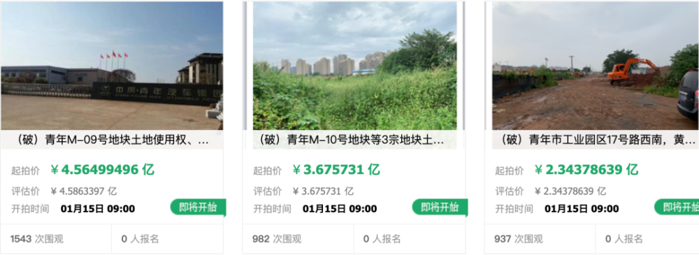 网站显示,相关拍卖从2022年末就已经开始,但拍卖进展并不顺利,在已经结束的多场拍卖中,部分标的物流拍被降为起拍价等待二次拍卖。据了解,先行拍卖的三项标的物是青年M-10号地块等三宗地块土地使用权和地上在建工程、青年M-09号地块土地使用权、建筑物构筑物和机器设备整体打包,以及青年市工业园区17号路西南,黄园村以东的土地使用权和在建工程。
